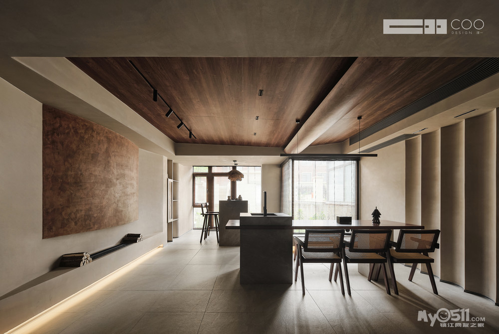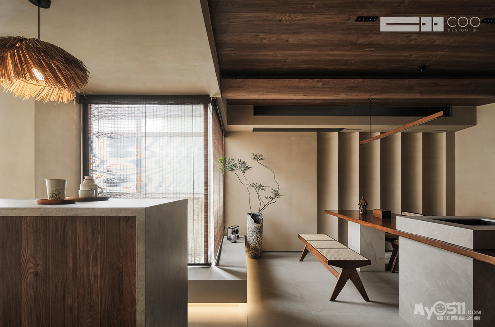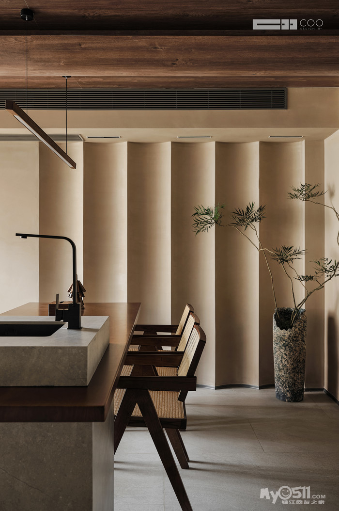 随着光影与肌理的碰撞,坚硬的石材与温润的木材,恰到好处地与柔和、内敛、含蓄的东方底蕴取得平衡。
