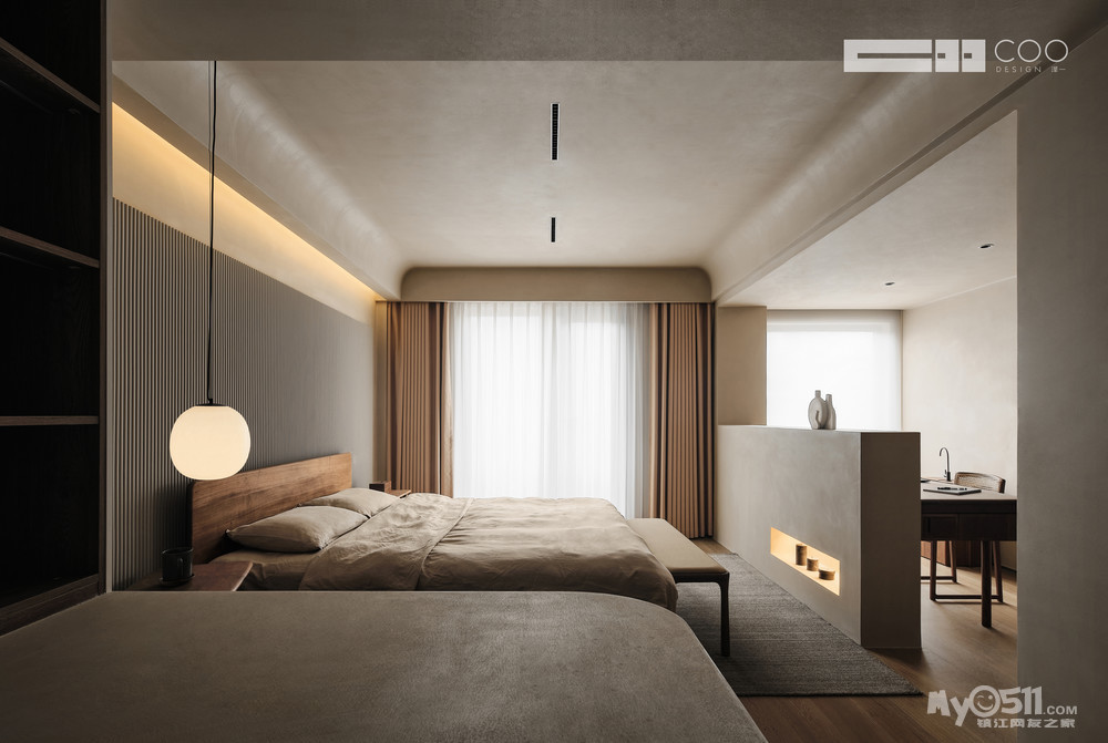 与公共区域的气质一致,私人休息空间温和恬静,同色系的立面空间和内敛朦胧的暖光吊灯,更好地营造出舒适温馨的氛围。